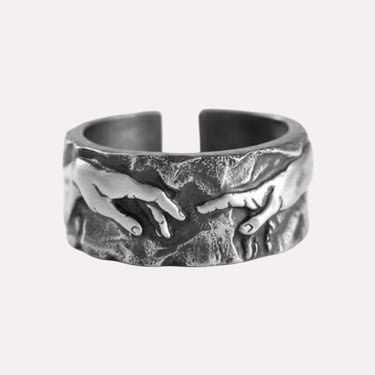 Inspired by Michelangelo’s masterpiece on the Sistine Chapel ceiling, this ring captures one of the most iconic images in art history - the moment of divine creation. Two hands, sculpted in striking relief, reach across the textured band, symbolizing the spark of life, the bond between mortal and divine, and the eternal human pursuit of connection.